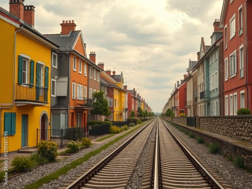 © PomPam, Fototapeta premium Overcast Railway & Residential Buildings - Vibrant AI Photo