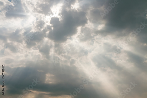 Obraz premium overcast sky with dark dramatic clouds and sun rays after thunderstorm.