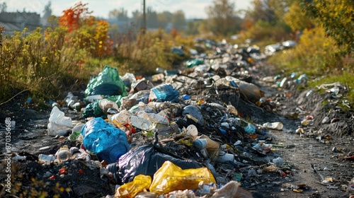 Obraz premium Overflowing garbage dump, linking waste management problems with environmental degradation