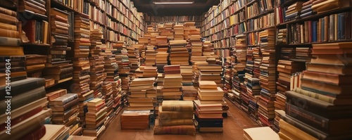 Fototapeta premium Overflowing library aisle, books stacked high, education, knowledge