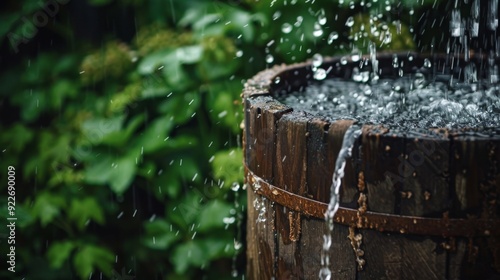 © Julia Jones, Fototapeta premium Overflowing Wooden Barrel in Rainy Garden Scene