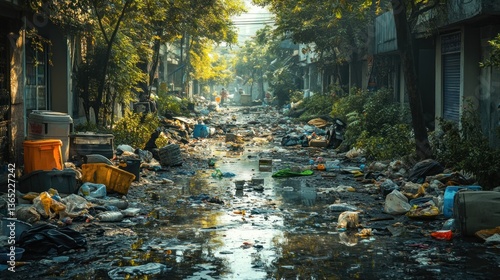 © akhmad, Obraz premium Overgrown Alleyway, Urban Garbage, Flooding, Sunlight Peeking Through Trees