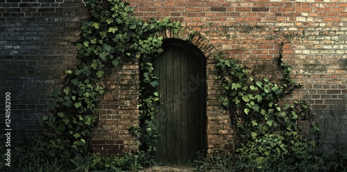 © NpicArt, Fototapeta premium Overgrown Brick Wall With Ancient Wooden Door