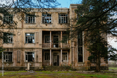 Fototapeta premium Overgrown by plants abandoned ruined house at ghost-town. Green...