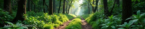 Fototapeta premium Overgrown dirt road snaking through a primeval forest, trees, wild, underbrush