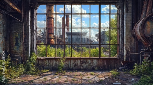 © pinporn manosri, Naklejka premium Overgrown Factory View Through Large Old Window with Blue Sky