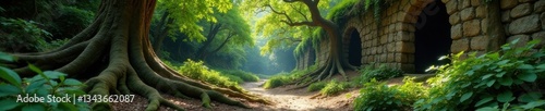 © Prayad, Fototapeta premium Overgrown forest with twisted tree roots and exposed stone walls, rough, woods