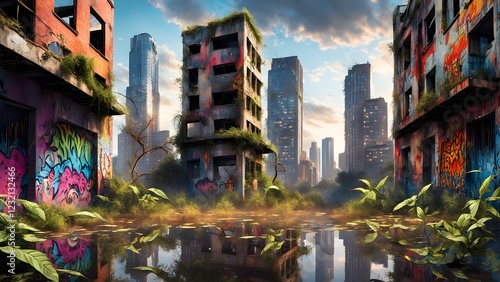 © Sutarto Stock, Obraz premium Overgrown, graffiti-covered ruins of a city reflect in a stagnant pool, juxtaposed against a backdrop of modern skyscrapers.