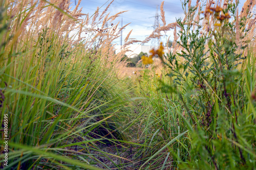Fototapeta premium Overgrown path in high grass, evening August nature landscape expressing...