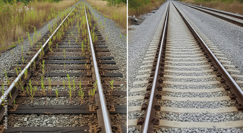 Fototapeta premium Overgrown railway tracks compared to fully restored rail line