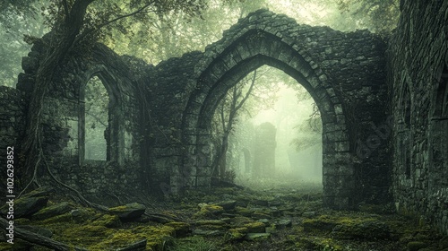 Obraz premium Overgrown Stone Archway Leading into a Misty Forest