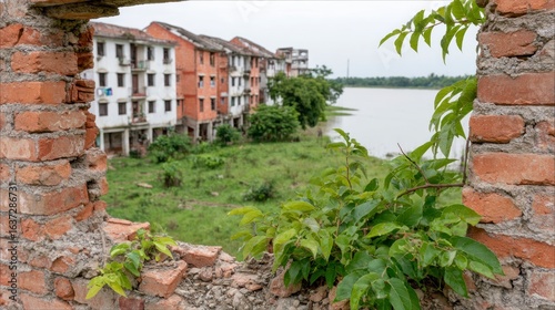 © BOJOShop, Fototapeta premium Overgrown vegetation frames a view of dilapidated buildings by a water body