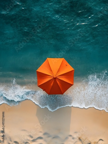 Naklejka premium Overhead Aerial View of Orange Umbrella on Beautiful Summer Beach