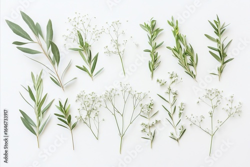 © yuniazizah, Naklejka premium Overhead Arrangement of Greenery and Delicate White Flowers on W