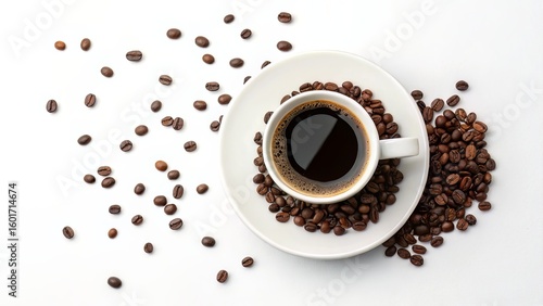 © Nobel, Obraz premium Overhead Coffee Scene with Beans and Cup on White Space for Minimal Breakfast Visuals