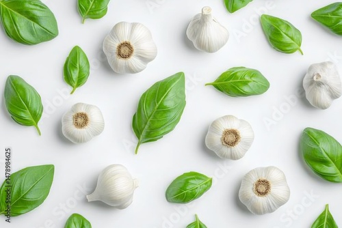 © Rayhans, Fototapeta premium Overhead Flat Lay of Fresh Green Basil Leaves and White Garlic Bulbs on a Clean White Background with Natural Lighting