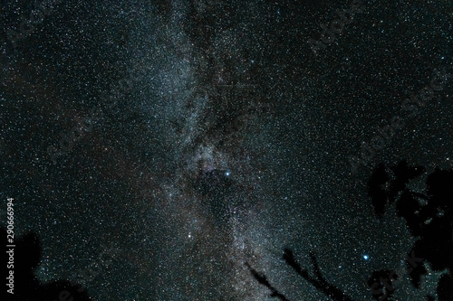 © nikwaller, Fototapeta premium Overhead milky way with stars in clear summer night. Old barn house. Country side.