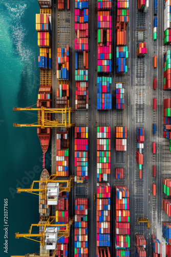 Obraz premium Overhead of a busy seaport, containers arranged in colorful patterns