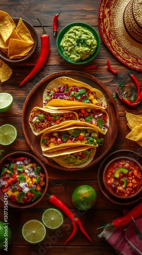 Fototapeta premium Overhead shot of a cinco de mayo feast featuring tacos, guacamole, salsa, tortilla chips, and lime, creating a vibrant and celebratory atmosphere