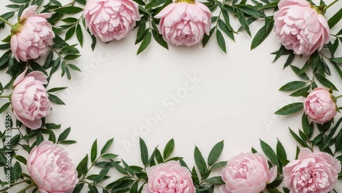 © AImmersive Imagery, Fototapeta premium Overhead shot of pink peonies, foliage, and scattered petals in a flat lay arrangement