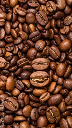 © Pipitcs32, Fototapeta premium Overhead shot of roasted, dark-brown, aromatic coffee beans