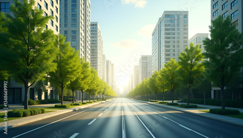 © Netaya, Fototapeta premium Overhead View of a Boulevard with Solar Trees: A Double Exposure Concept Showcasing Green Energy Innovation and Renewable Infrastructure with Ample Copy Space for Text
