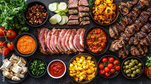 Fototapeta premium Overhead View of a Grilling Station with Various Delicious Dishes