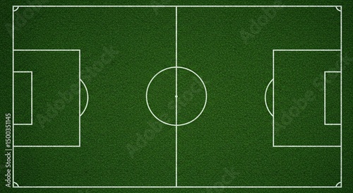 © Cleverson, Obraz premium Overhead view of a vibrant green sports field, marked with precise white lines delineating the playing area and goal zones.