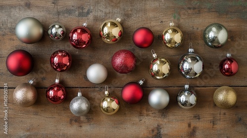 © Степан Озарчук, Naklejka premium Overhead view of assorted red, gold and silver Christmas baubles on a wooden table