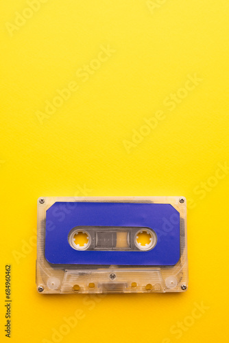 Obraz premium Overhead view of blue cassette tape with copy space on yellow background