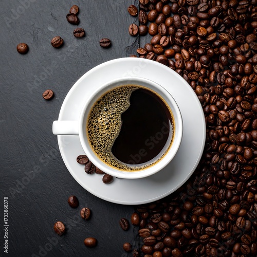 © Dua, Fototapeta premium Overhead view of coffee cup and beans