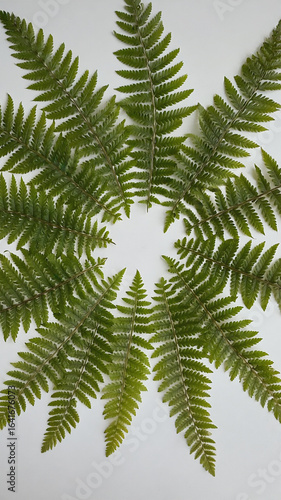 © MOHAMED, Naklejka premium Overhead view of delicate fern leaves arranged in radial symmetry on white background