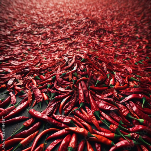 Fototapeta premium Overhead view of dry red pepper. Close-up chili peppers. Red and green background. Concept growing and harvesting organic vegetables.