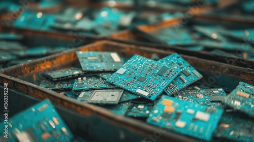 © Nongkhane, Obraz premium Overhead view of e-waste recycling process in industrial setting a sustainability concept