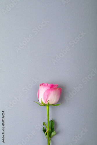 © wavebreak3, Fototapeta premium Overhead view of fresh pink rose isolated on gray background, copy space