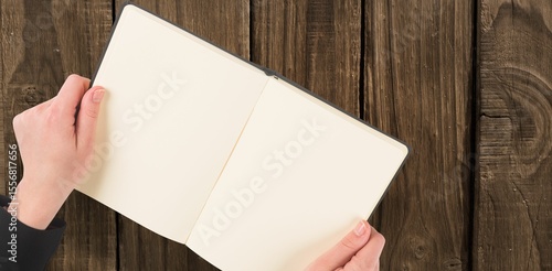 © vectorfusionart, Naklejka premium Overhead view of hand holding book