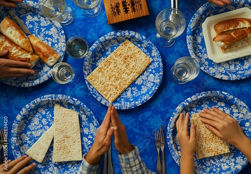 © Abdul, Fototapeta premium Overhead View of Passover Seder Table with Matzah, Family, and Food
