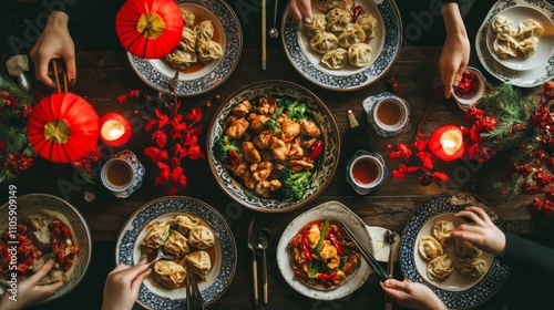 © Pichapob, Fototapeta premium Overhead View of Rustic Chinese Dining Table Set with Delicious Dishes