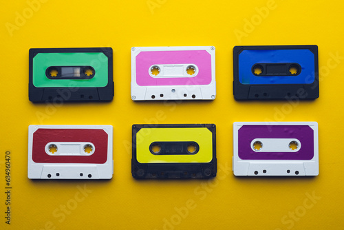 © vectorfusionart, Fototapeta premium Overhead view of six colourful cassette tapes arranged on yellow background
