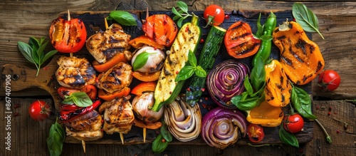 Fototapeta premium Overhead view of vegetables and chicken grilled on a wooden surface