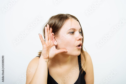 © aeroking, Fototapeta premium Overhears a woman, tries to listen.