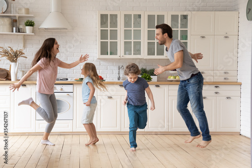 © fizkes, Naklejka premium Overjoyed young family with little children dancing enjoying leisure weekend in kitchen, happy parents have fun feel playful engaged in funny activity with small kids at home, entertainment concept