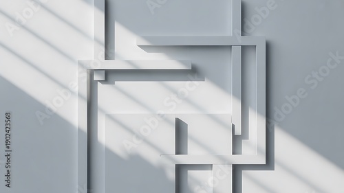 © Trendy Three, Obraz premium Overlapping white geometric frames on monochromatic wall creating intricate shadows pattern