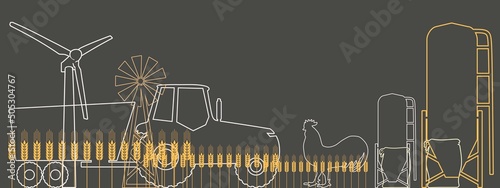 Fototapeta premium Overlayed outline icons of rooster, wind turbine and tractor. Ecologically...