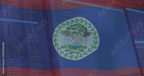 © vectorfusionart, Naklejka premium Overlaying Belize flag covering monitors at tech workstation, showing coat of arms and code