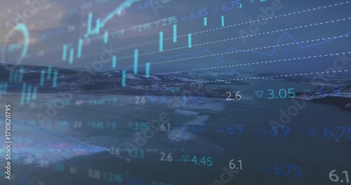 Fototapeta premium Overlaying blue green candlestick bars highlighting coastal bay, with jagged line graph indicators