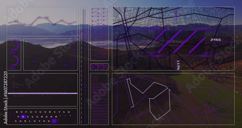 © vectorfusionart, Naklejka premium Overlaying interface panels over mountain valley lake, showing graphs, dials, code text and map
