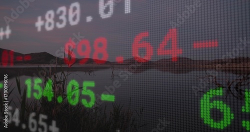 © vectorfusionart, Fototapeta premium Overlaying semi-transparent stock ticker display across lakeshore reeds at dusk, with stock numbers