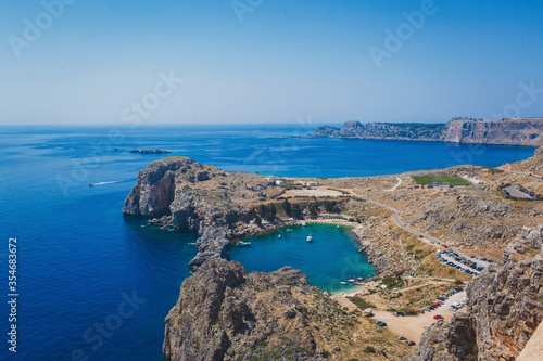 © p_r_g, Fototapeta premium Overlooking the blue Aegean Sea from the Acropolis, Lindos, Greece