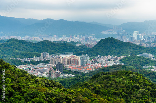 Obraz premium Overlooking the urban architectural landscape of the Neihu and Nangang in Taipei, Taiwan, surrounded by green forests and mountains.